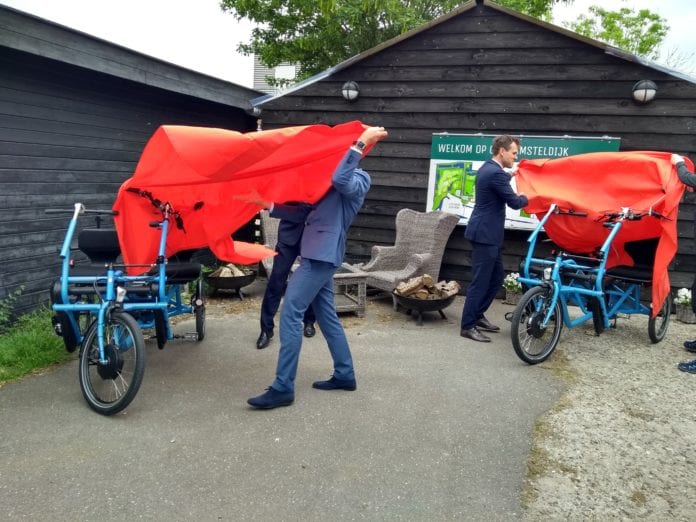 “Een voordeel is dat je als berijders met elkaar in gesprek kunt blijven”, zei iemand van de Stichting Fietsmaatjes Amstelveen. Op het belang van elkaar ontmoeten en beweging wees ook sportwethouder Rob Ellermeijer. Samen met zijn collega Marijn van Ballegooijen onthulde hij de eerste twee elektrische duofietsen van de stichting, bij Brasserie 10 op de golfbaan (foto).