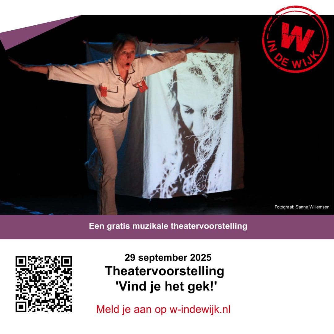 De voorstelling wordt gegeven in de ‘Week van de Ontmoeting’. Na afloop van de voorstelling is er daarom gelegenheid na te praten tijdens een lichte maaltijd. Meer informatie en aanmelding op https://w-indewijk.nl/evenementen/theatervoorstelling-vind-je-het-gek/.