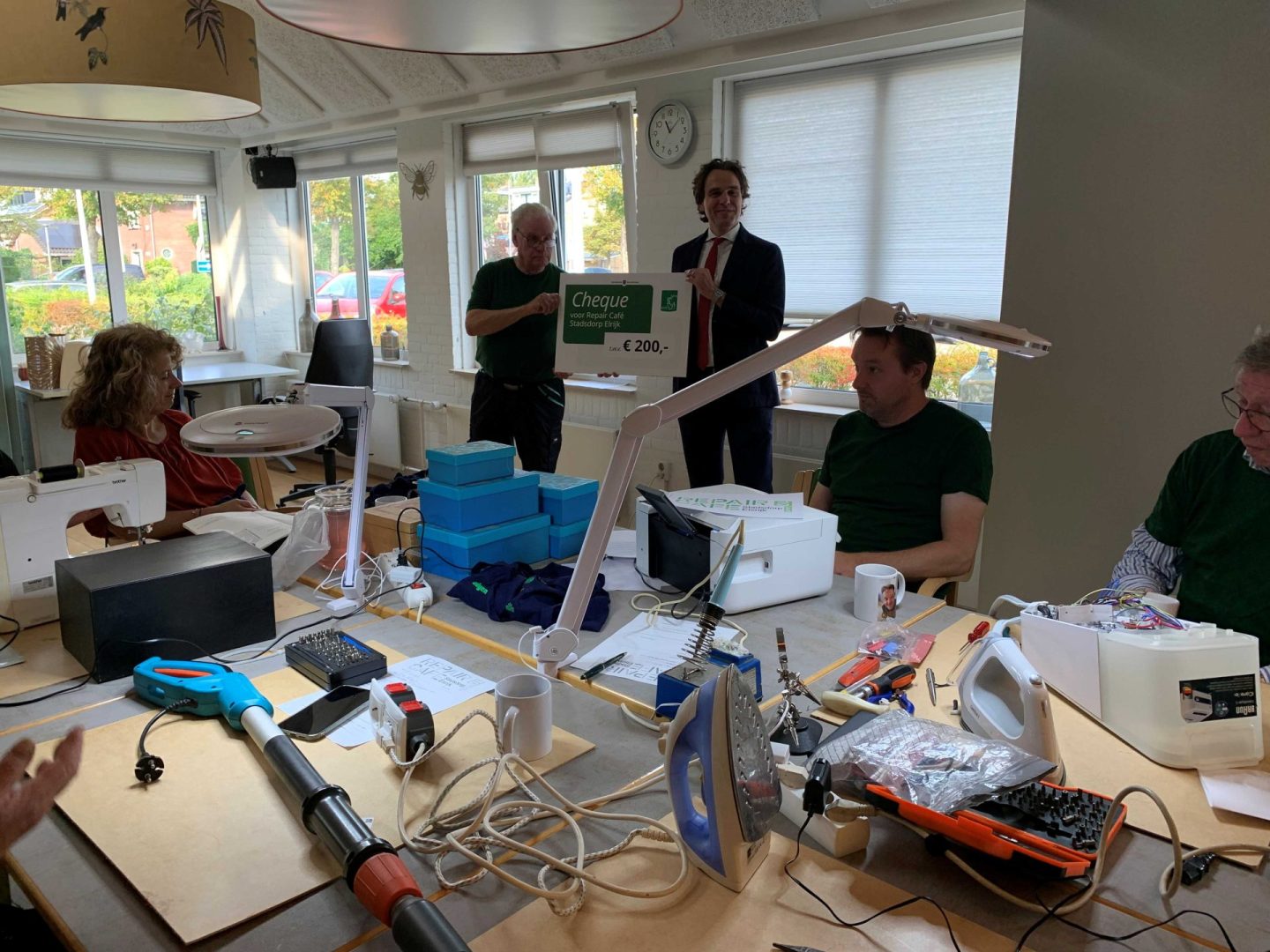 Zoals bij de gemeente gebruikelijk buiten de media heeft wethouder Marijn van Ballegooijen zaterdag (20 september) symbolisch een cheque aan het Repair Café Elsrijk overhandigd als blijk van waardering en om het belang te benadrukken van de cafés voor de samenleving. De gemeente ontving van WeCycle een bedrag van 1.000 euro voor de inzameling van elektronisch afval tijdens Koningsdag. Dit bedrag verdeelt de gemeente over de vijf Repair Cafés in Amstelveen voor de aanschaf van reparatiematerialen.