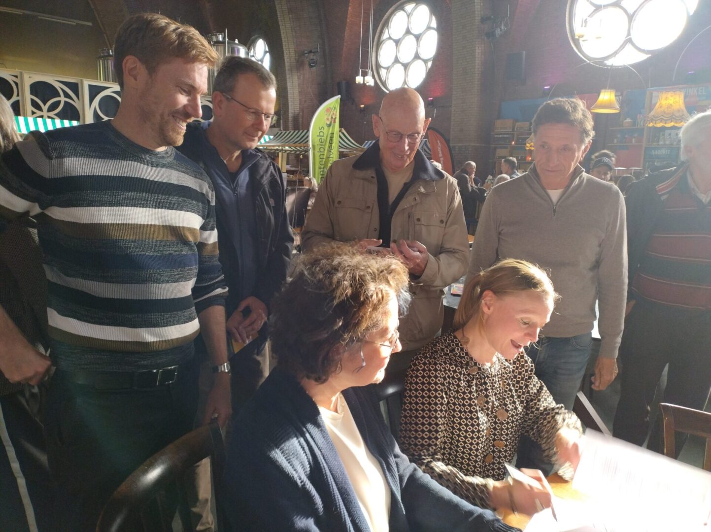 Omgeven door raadsleden rekende wethouder Floor Gordon van Duurzaamheid zaterdag (8 november) namens de gemeente een intentieovereenkomst met de Energiecoöperatie Elsrijk (foto), een onderdeel van Stadsdorp Elsrijk. De uitdaging voor de energiecoöperatie is, zegt zij, de komende jaren de huizen warm en koel te houden zonder aardgas, een kolfje naar de hand van de wethouder. De ondertekening vond plaats op de markt ‘Doe het duurzaam’ in de voormalige Annakerk.