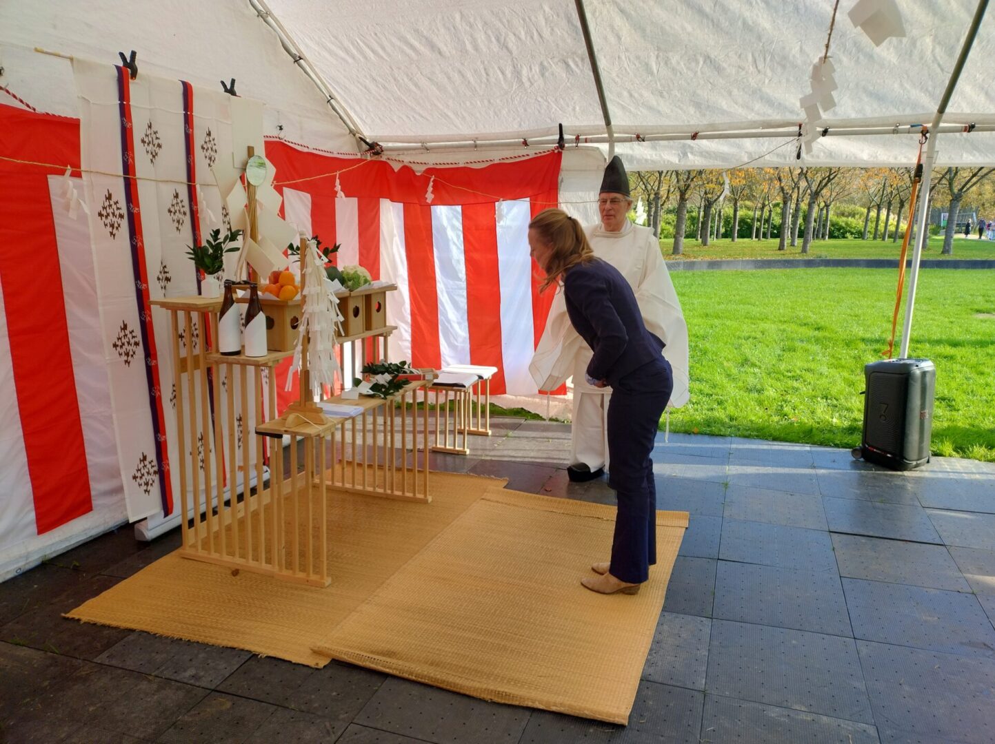 Om eerbied voor de natuur ging het zondagmiddag, kort gezegd. Daar kon wethouder Floor Gordon (D66), die Duurzaamheid in haar portefeuille heeft, geen bezwaar tegen hebben. Daarom nam zij ook deel aan de shinto ceremonie, onder leiding van een shintomeester (een shinkan) en dankte zij uitgebreid namens het gemeentebestuur voor de komende opknapbeurt van het bloesempark.