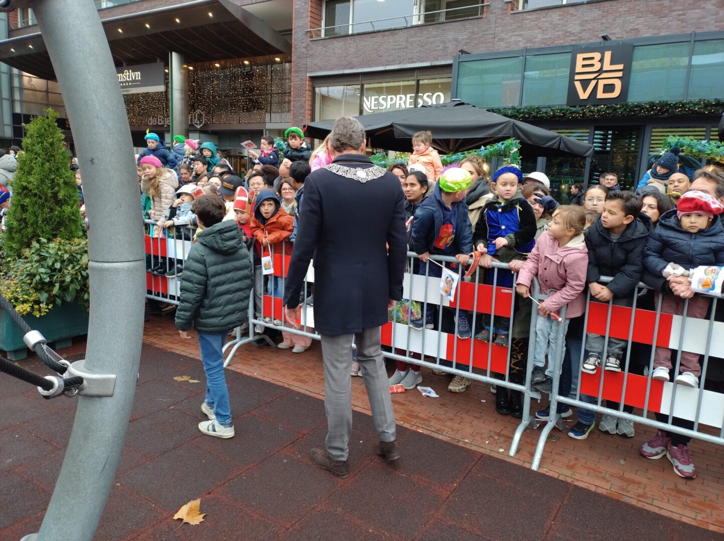 Tegen twaalven verliet een gezin de wijk om Sinterklaas te zien aankomen op het Stadsplein, waar al dichte drommen kinderen en hun ouders stonden. “Het lijkt wel of er elk jaar meer mensen komen”, zei de Sint zelf. Het gezin sprak overigens een van de vele talen die de internationale stad met zich meebrengt, maar wilde kennelijk zich bij de Nederlandse cultuur aansluiten, wat de gemeente als ‘verbinding’ ziet.