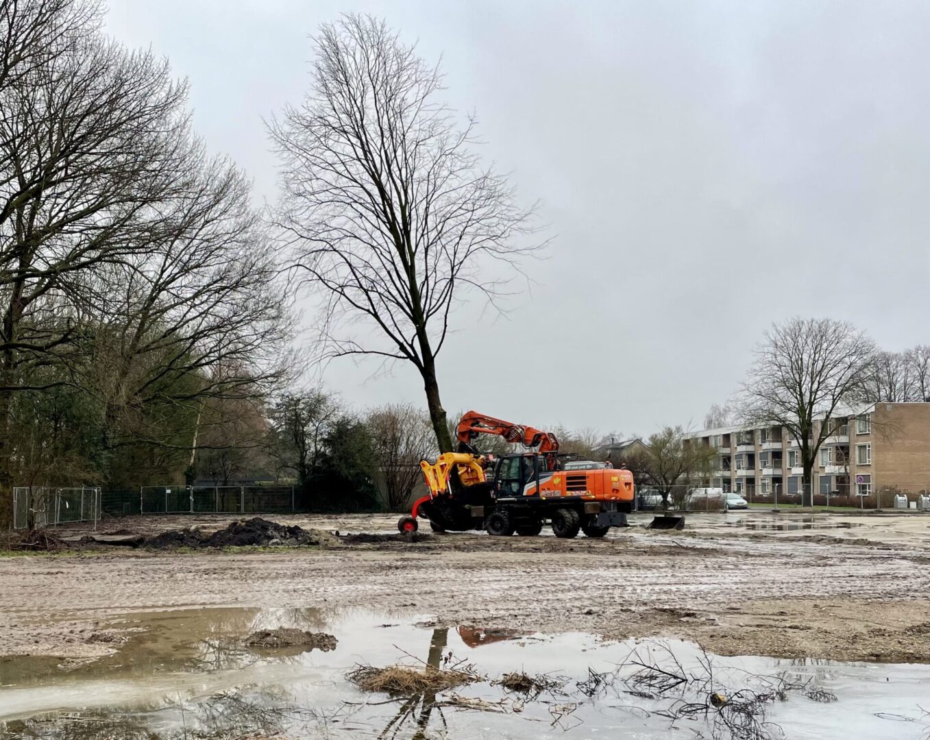 Er was donderdag een speciale machine voor nodig om de bomen vijftig meter te verplaatsen van de plek waar woningen komen naar de rand van het schoolplein.