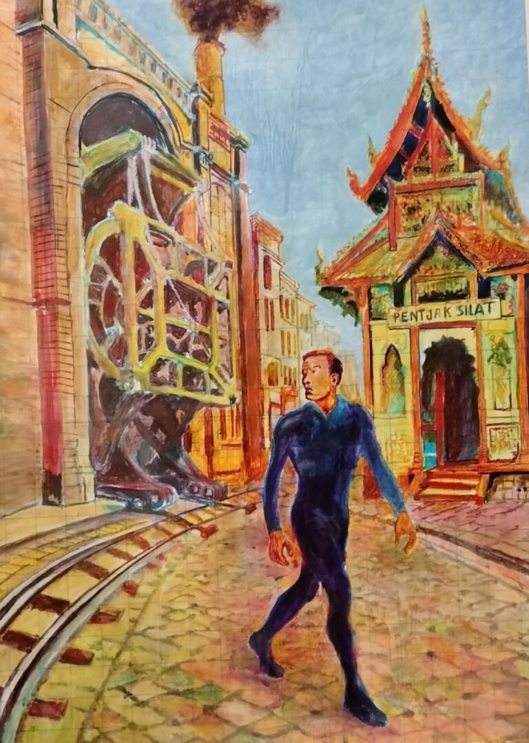 Cor legt uit dat hij zich gebaseerd heeft op een droom die hij had: “Ik loop naar het theater waar ik een dansvoorstelling doe. Als ik door de Charlotte de Bourbonstraat loop, zie ik links een enorme machine die als een ademhaling op rails uit en in een grote loods beweegt. Rechts zie ik een Indonesische kerk waarop “Pentjak Silat” staat.”