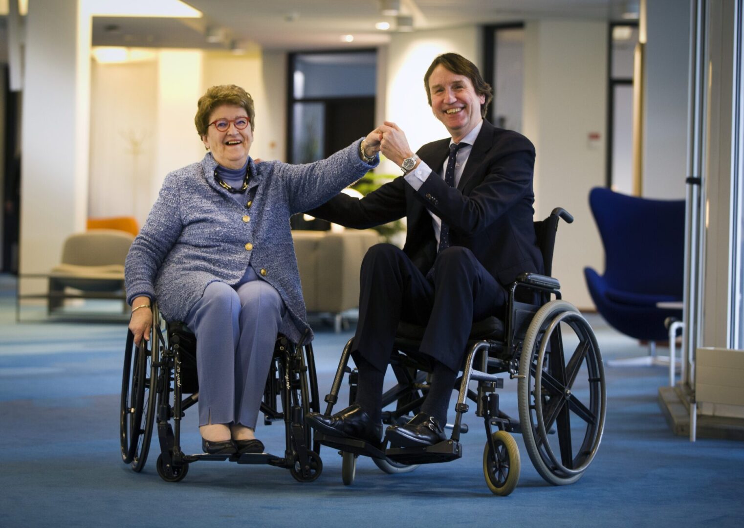 Fotobijschrift: Corrie van Hugten, van Stichting Rolstoeldansen Nederland, toetst regelmatig rolstoeltoegankelijkheid van de gemeente. Op de foto samen met wethouder Herbert Raat. Foto: Anko Stoffels
