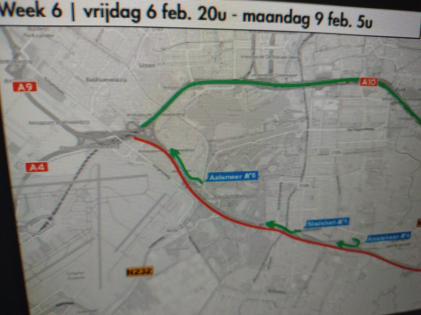 In verband met werkzaamheden is de A9 vanaf knooppunt Badhoevedorp richting Holendrecht in één richting afgesloten van vrijdag 6 februari 20.00 tot maandagochtend 9 februari 05.00 uur. Het verkeer vanuit Badhoevedorp wordt omgeleid via de A10 en de A2.