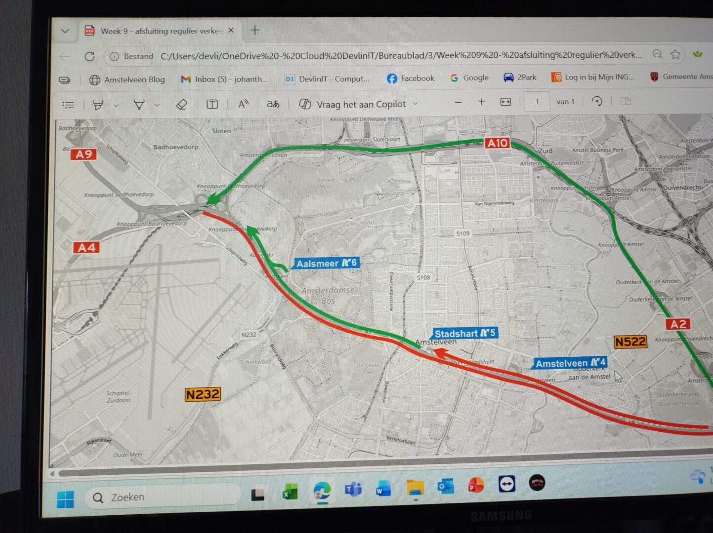 Wegens werkzaamheden is de A9 van vrijdag 27 februari 20.00 uur tot maandag 2 maart 05.00 uur tussen de knooppunten Badhoevedorp en Holendrecht in beide richtingen afgesloten. De oprit 5b Stadhart en oprit 6 Aalsmeer richting Schiphol/Haarlem zijn wel open.