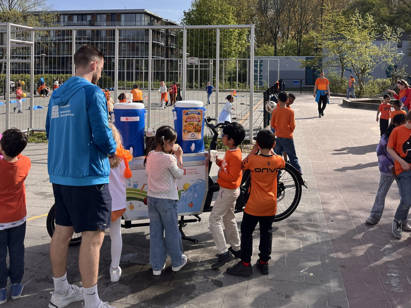 De buurtsportcoaches doen dat met De Beweegbus, een rijdend podium voor sport- en spelactiviteiten. De JOGG-regisseurs laten kinderen op een smakelijke manier kennismaken met het belang van voldoende water drinken. Sven ven Kuit rijdt langs de scholen met de waterbakfiets, beladen met fruitwater, door de kinderen zelf gedoopt tot ‘Koningswater’. Alle leerlingen krijgen ook een appel mee als gezonde snack. Sven betrekt de kinderen actief bij het thema: hij legt uit waarom voldoende water drinken belangrijk is, en laat zien hoe je water lekker en gezond kunt maken met fruit. Het fruitwater wordt mede mogelijk gemaakt door Zorg en Zekerheid. Door kinderen al vroeg te laten ervaren dat bewegen en water drinken, zegt AS aan een generatie die gezonde keuzes vanzelfsprekend vindt te werken.